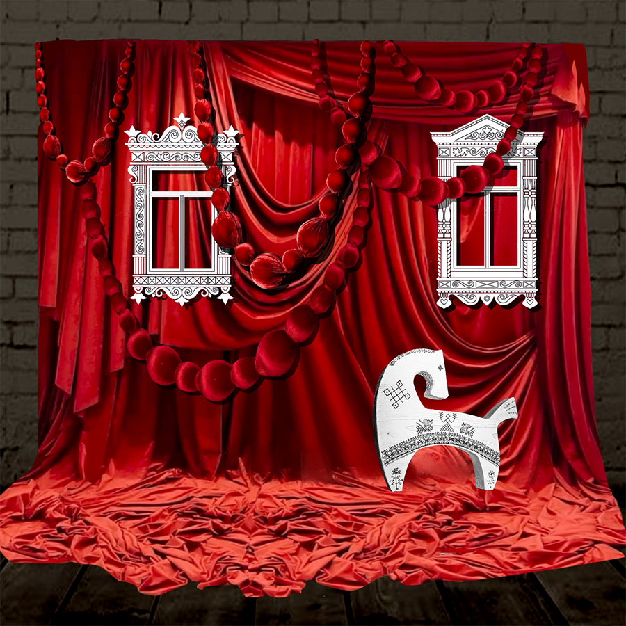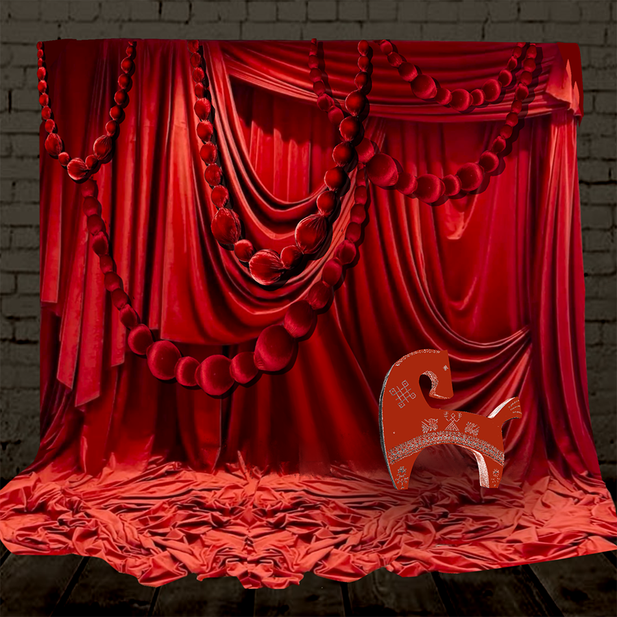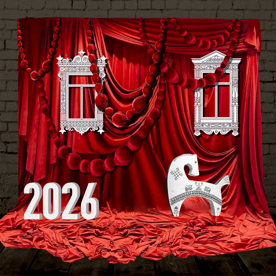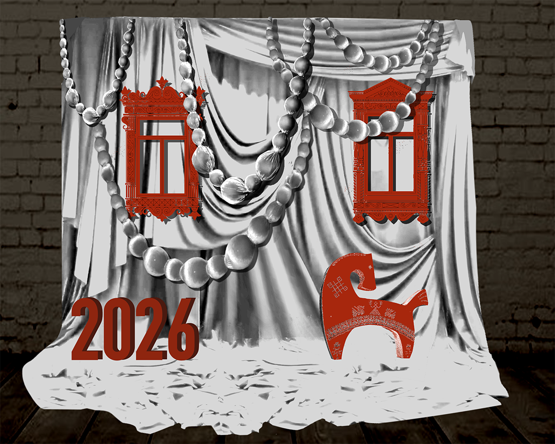 Встречайте 2026 год в лучших русских традициях! Наша фотозона создана для тёплых и душевных кадров. Глубокий бархат, резные деревянные рамы и алые бусы создают атмосферу настоящего народного праздника.
